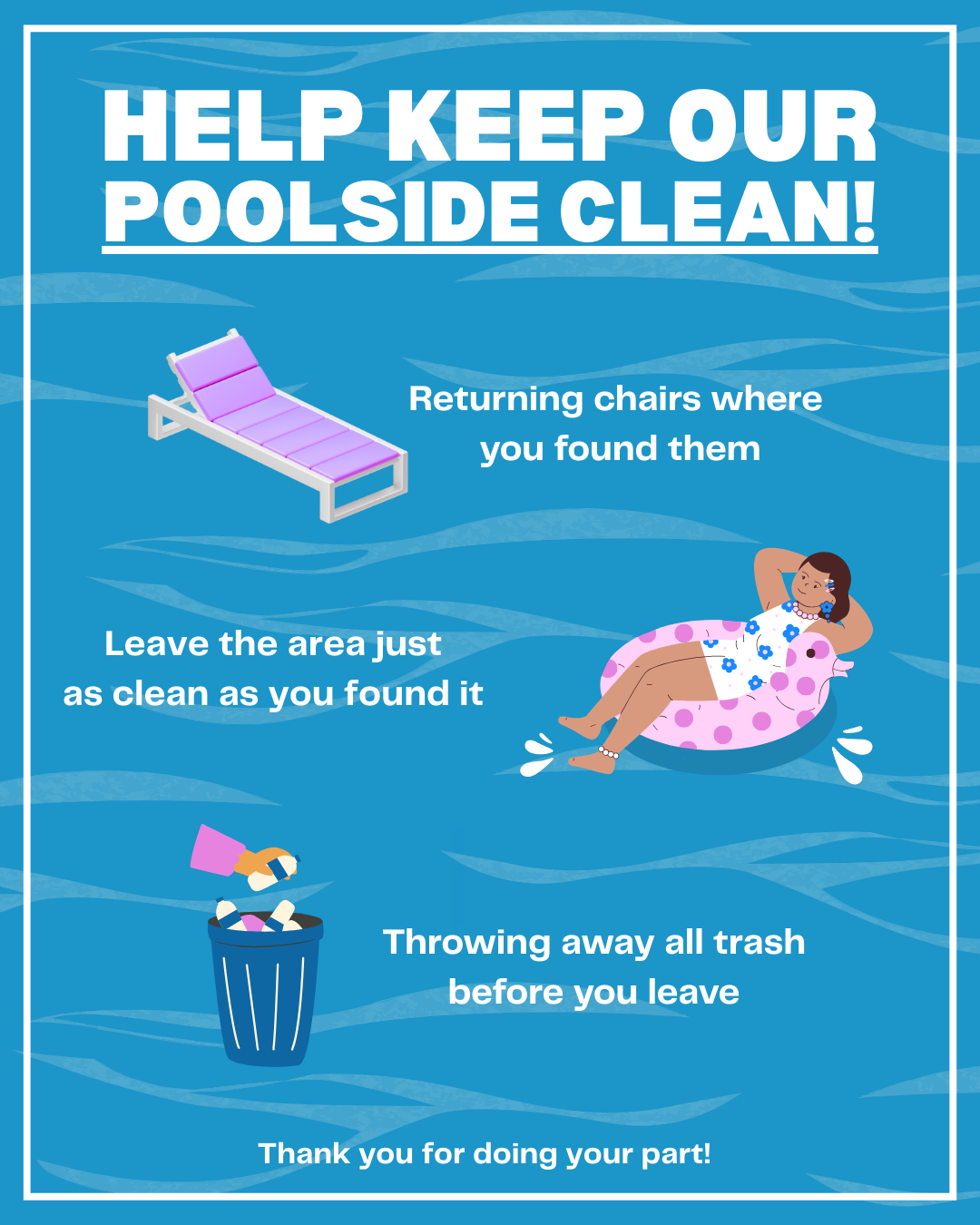 Developed a poster promoting a Poolside Cleanup initiative, highlighting the importance of keeping public spaces safe and enjoyable. The design balances informative text with eye-catching imagery to inspire action.